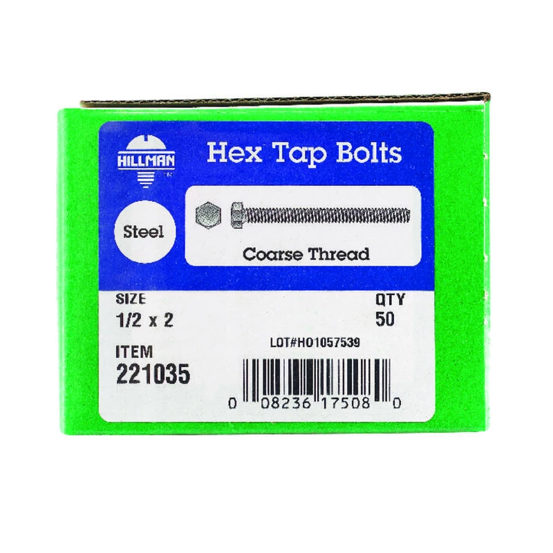Hex tap bolts are fully threaded machine bolts, designed to adhere facing materials to prevent shear movement; specifically for use in wood to wood, wood to metal, or metal to metal applications. Zinc, grade 2 hex bolts are recommended for most general uses and are corrosion resistant for typical use. Be sure to pre-drill any holes and to use washers and nuts that are a similar grade and finish. *