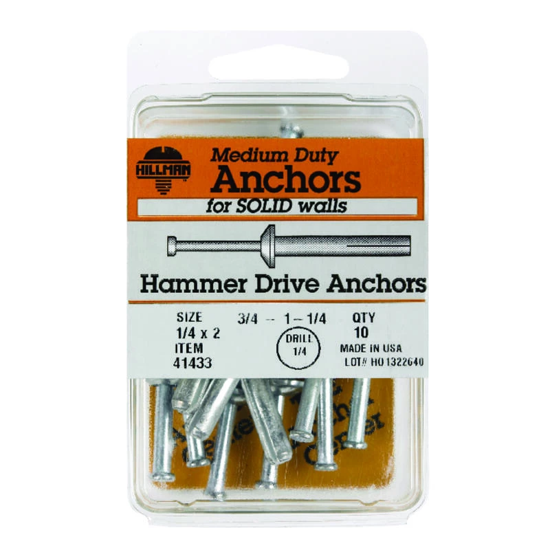 Hammer drive anchors are used for light duty fastening. They are best suited for dry, or indoor environments. Do not use for overhead installation projects. They can be used in base materials such as brick, concrete, and concrete block. Installations are permanent and cannot be removed without destroying. *