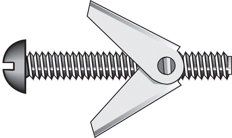 Toggle bolts come with spring-action wings and are intended for anchoring into hollow walls. The wing is designed to spread apart behind the base material upon installation for firm hold in hollow wall applications. The wing disperses the weight of the secured item over a larger area, increasing the weight that can be secured compared to a regular bolt. *