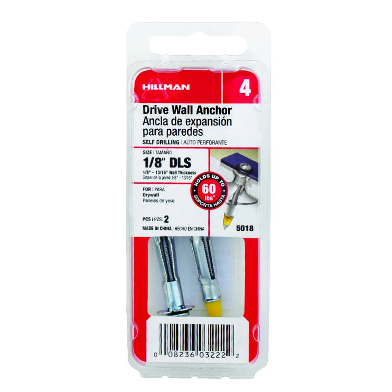 Hillman 1/8 DS Drive Wall Anchor gives greater holding power than nails or screws in a hollow wall. Quick and easy to install, it drives right into places in seconds with no pre-drilling. Fixtures can be replaced or removed without having to detach the anchors. *