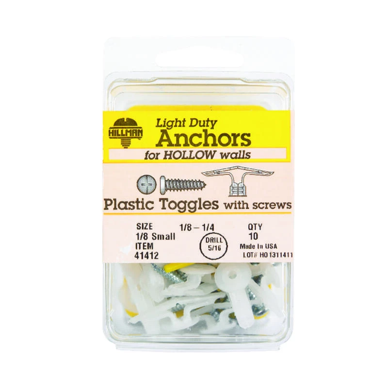 Pop toggles work with various diameter sheet metal screws. They are ideal for anchoring into hollow base materials such as drywall, and will also hold strong in solid materials such as wood studs, concrete or block. Then anchor is corrosion resistant. Pre-drilling is required for installation. *