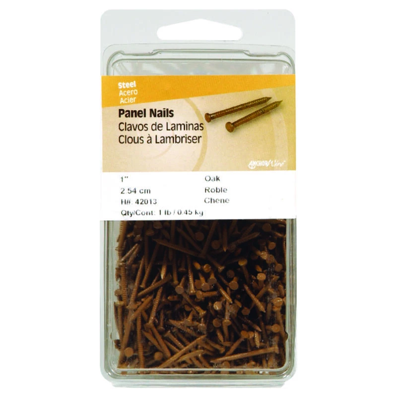 For a clean, finished look when hanging paneling or other indoor materials, use Hillman Painted Panel Nails. These nails are made of steel for durability and feature a durable coated finish painted to blends into your paneling project. *