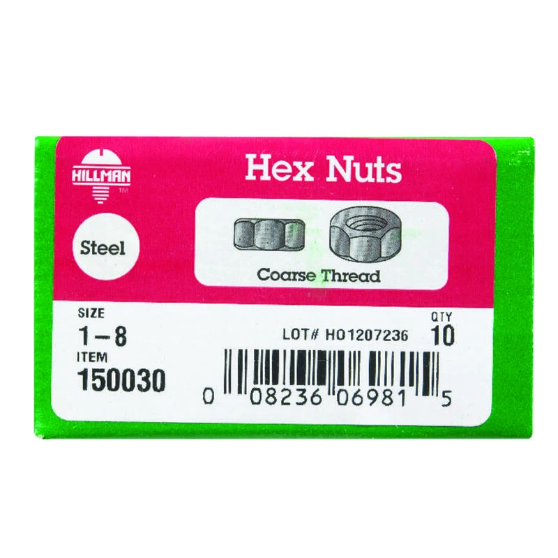 Hex nuts are to be used with machine bolts to adhere facing materials to prevent tension and shear movement. Specifically in wood to wood, wood to metal, or metal to metal applications. Tri-alloy grade 8 steel hex nuts are recommended for most outdoor construction uses and are corrosion resistant. Be sure to pre-drill any holes and to use washers and bolts that are a similar grade and finish. *