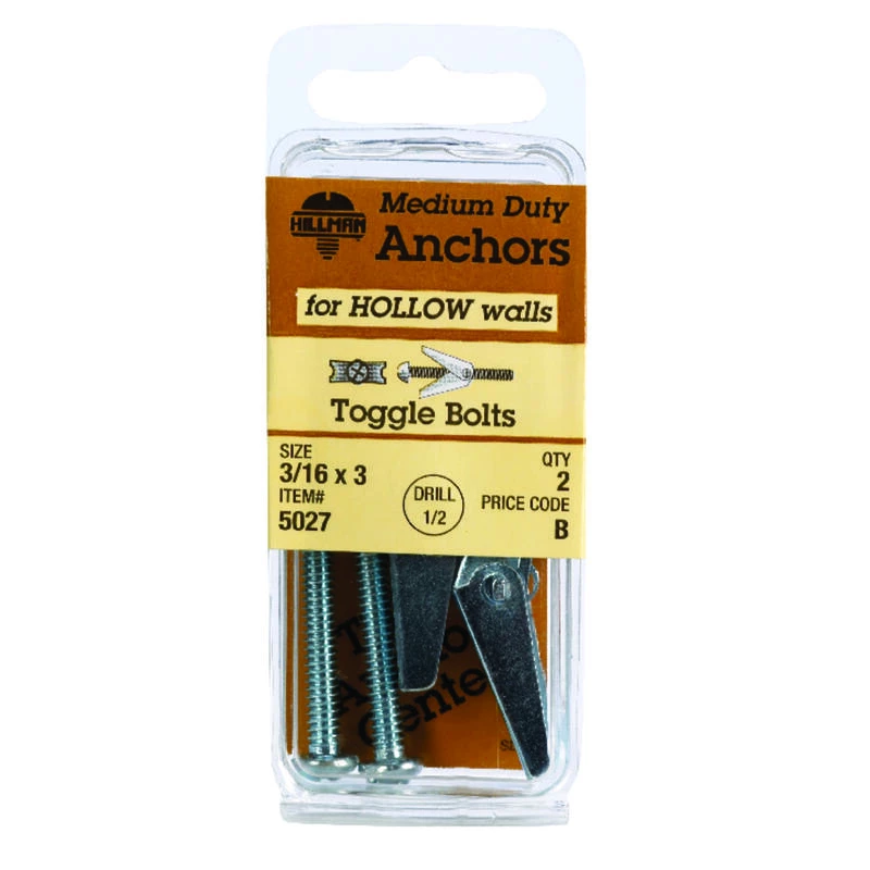 Toggle bolts come with spring-action wings and are intended for anchoring into hollow walls. The wing is designed to spread apart behind the base material upon installation for firm hold in hollow wall applications. The wing disperses the weight of the secured item over a larger area, increasing the weight that can be secured compared to a regular bolt.