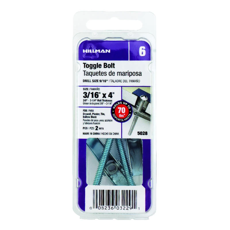 Toggle bolts come with spring-action wings and are intended for anchoring into hollow walls. The wing is designed to spread apart behind the base material upon installation for firm hold in hollow wall applications. The wing disperses the weight of the secured item over a larger area, increasing the weight that can be secured compared to a regular bolt.