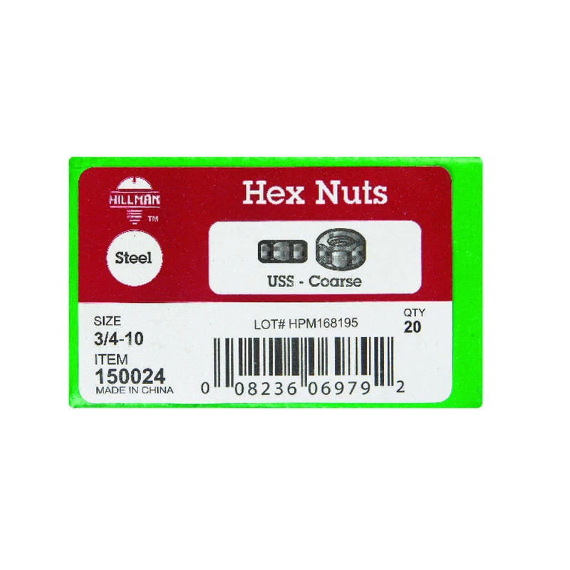 Hex nuts are to be used with machine bolts to adhere facing materials to prevent tension and shear movement. Specifically in wood to wood, wood to metal, or metal to metal applications. Zinc grade 2 steel hex nuts are recommended for most general uses and are corrosion resistant. Be sure to pre-drill any holes and to use washers and bolts that are a similar grade and finish. *