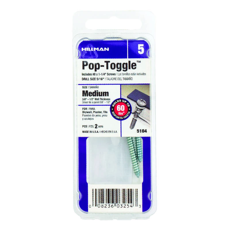 Pop toggles work with various diameter sheet metal screws. They are ideal for anchoring into hollow base materials such as drywall, and will also hold strong in solid materials such as wood studs, concrete or block. Then anchor is corrosion resistant. Pre-drilling is required for installation. *