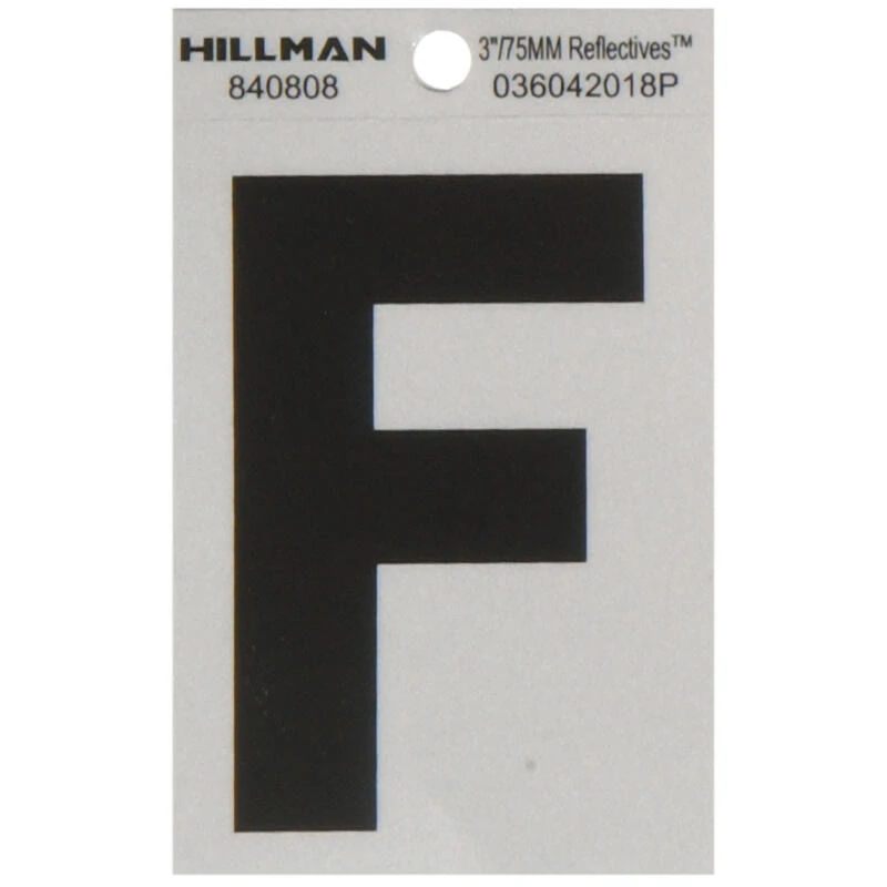 Simple and classic, this Hillman adhesive letter f black and silver reflective (3 in.) is perfect for use on a mailbox or your home. The sturdy construction stands up to weather. These house numbers are a great way to help make your address more visible to visitors and emergency workers alike.