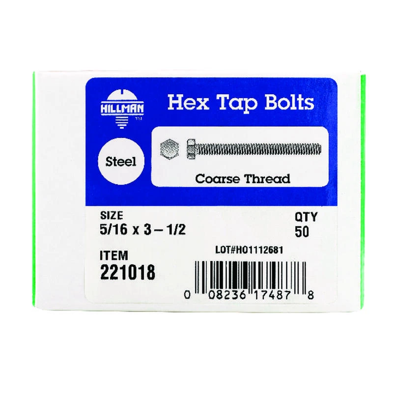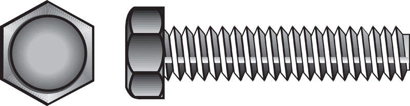 Hex tap bolts are fully threaded machine bolts, designed to adhere facing materials to prevent shear movement; specifically for use in wood to wood, wood to metal, or metal to metal applications. Zinc, grade 2 hex bolts are recommended for most general uses and are corrosion resistant for typical use. Be sure to pre-drill any holes and to use washers and nuts that are a similar grade and finish. *