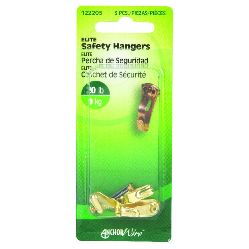 This brass plated safety hanger with ensure maximum hold with built in clip. This Elite Safety Hanger securely hangs up to 20lbs. Finish your gallery with a safe and classic look. Great for drywall and plaster walls.