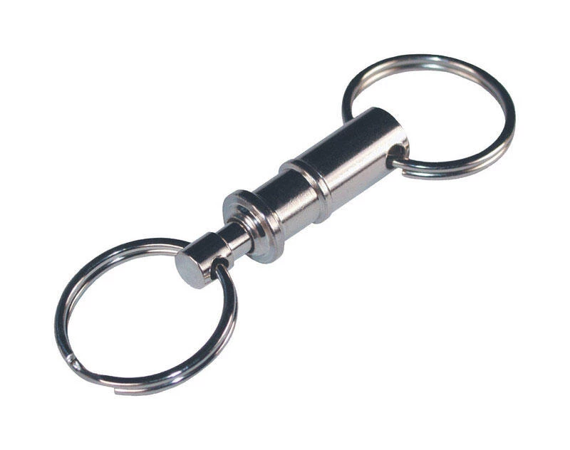 The easy release key chain allows you to easily separate your car or house key from your other keys, which makes leaving a car key or house key safe and easy. The push button action allows you to easily separate the two key chain. Each side of the key chain has a 1 In spring steel split ring attached to it with a third 1 In ring in the center. *
