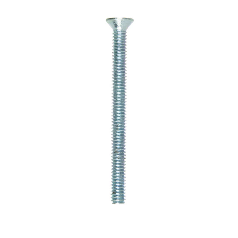 Zinc, flat-head, Phillips-drive machine screws have a machine-cut thread throughout the length of their shank. Fasten with a Phillips screwdriver to reduce risk of over-tightening and protect the screw and fastened material. If nuts are needed, use with nuts of the same finish and threading for proper fit. Use for any indoor or outdoor projects. 1/4″-20 coarse thread x 3″ length. *