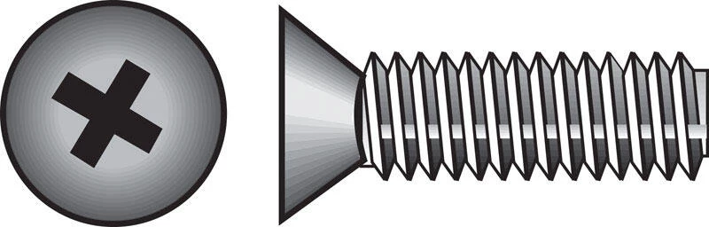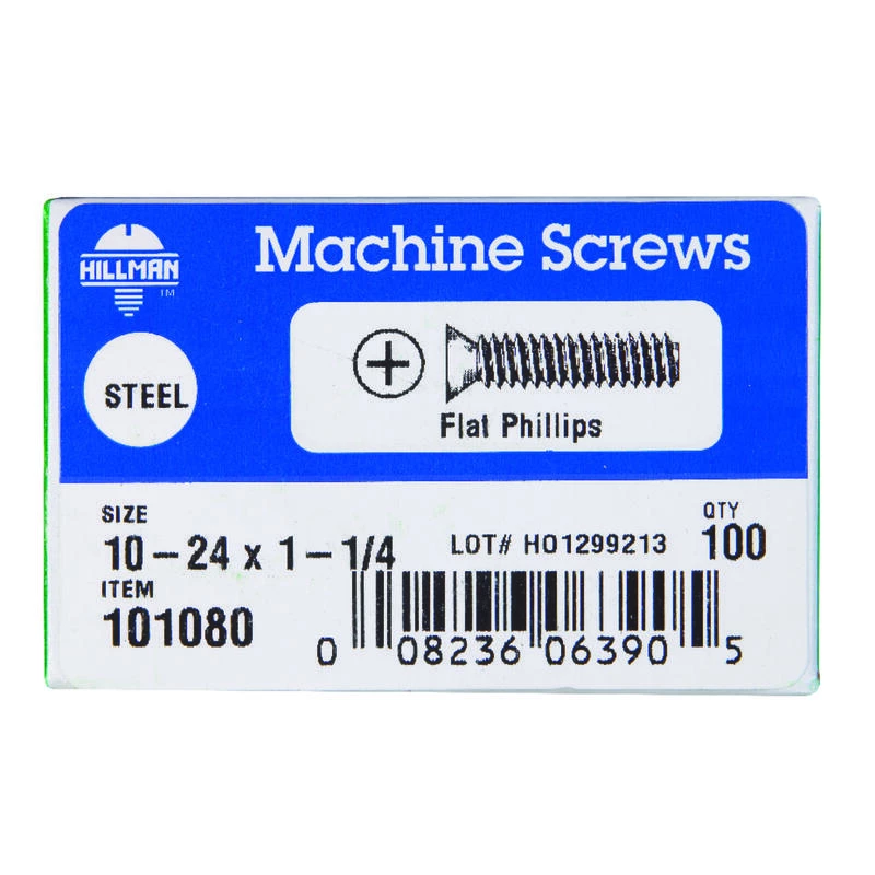 Zinc, flat-head, Phillips-drive machine screws have a machine-cut thread throughout the length of their shank. Fasten with a Phillips screwdriver to reduce risk of over-tightening and protect the screw and fastened material. If nuts are needed, use with nuts of the same finish and threading for proper fit. Use for any indoor or outdoor projects. #10-24 coarse thread x 1-1/4″ length. *