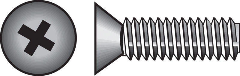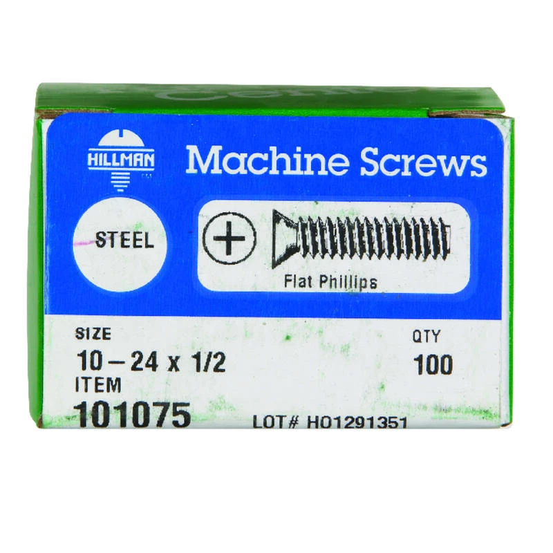 Zinc, flat-head, Phillips-drive machine screws have a machine-cut thread throughout the length of their shank. Fasten with a Phillips screwdriver to reduce risk of over-tightening and protect the screw and fastened material. If nuts are needed, use with nuts of the same finish and threading for proper fit. Use for any indoor or outdoor projects. #10-24 coarse thread x 1/2″ length. *