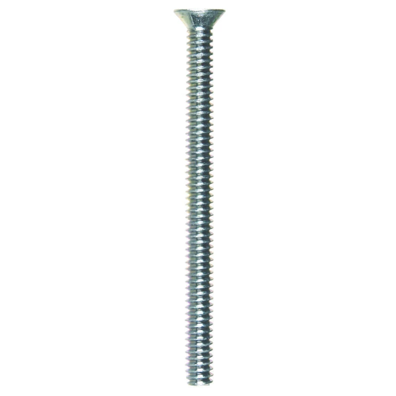 Zinc, flat-head, Phillips-drive machine screws have a machine-cut thread throughout the length of their shank. Fasten with a Phillips screwdriver to reduce risk of over-tightening and protect the screw and fastened material. If nuts are needed, use with nuts of the same finish and threading for proper fit. Use for any indoor or outdoor projects. #10-24 coarse thread x 2-1/2″ length. *