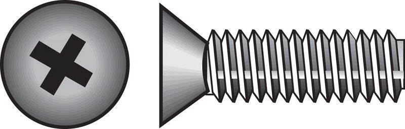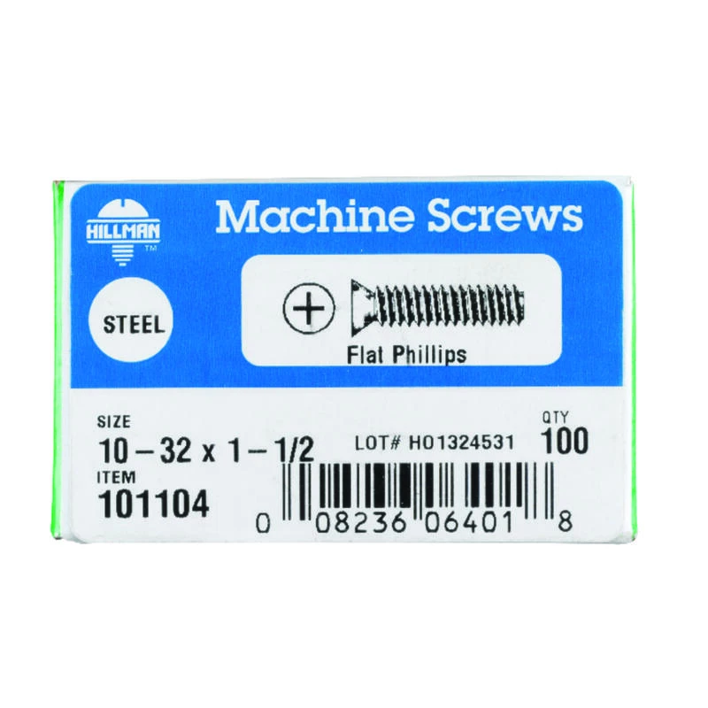 Zinc, flat-head, Phillips-drive machine screws have a machine-cut thread throughout the length of their shank. Fasten with a Phillips screwdriver to reduce risk of over-tightening and protect the screw and fastened material. If nuts are needed, use with nuts of the same finish and threading for proper fit. Use for any indoor or outdoor projects. #10-32 fine thread x 1-1/2″ length. *