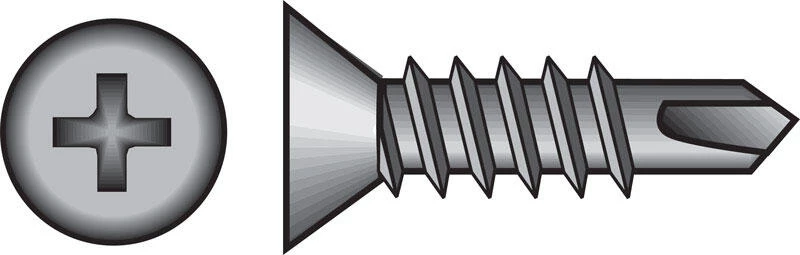 This self-drilling screw is used in wood, fiberglass, and metal, and it possess a drill point enabling it to drill its own hole in thin gauge steel. The sharp threads create their own mating thread when drilled into the material. No pre-drilled pilot holes are necessary. *