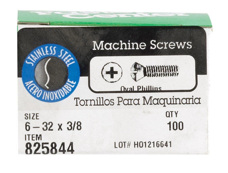 18-8 stainless steel, oval-head, Phillips-drive machine screws have a machine-cut thread throughout the length of their shank. Fasten with a Phillips screwdriver to reduce risk of over-tightening and protect the screw and fastened material. If nuts are needed, use with nuts of the same finish and threading for proper fit. Use for any indoor or outdoor projects. #6-32 coarse thread x 3/8″ length. *