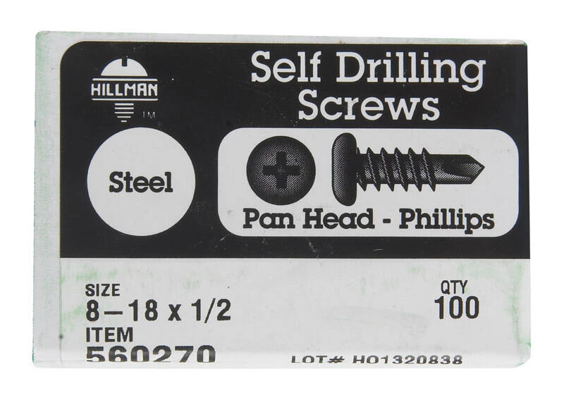 This self-drilling screw is used in wood, fiberglass, and metal, and it possess a drill point enabling it to drill its own hole in thin gauge steel. The sharp threads create their own mating thread when drilled into the material. No pre-drilled pilot holes are necessary. *