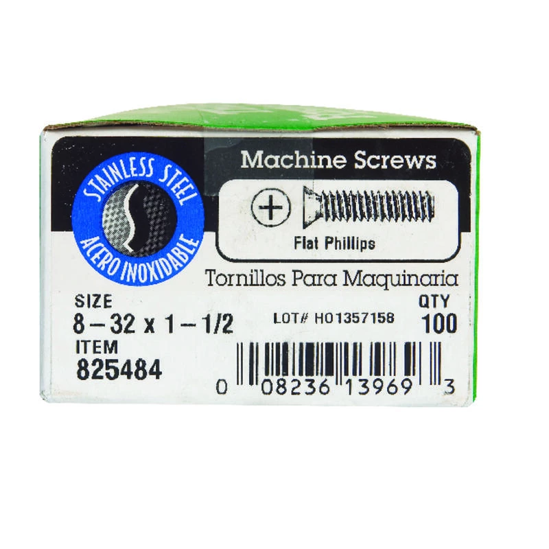 18-8 stainless steel, flat-head, Phillips-drive machine screws have a machine-cut thread throughout the length of their shank. Fasten with a Phillips screwdriver to reduce risk of over-tightening and protect the screw and fastened material. If nuts are needed, use with nuts of the same finish and threading for proper fit. Use for any indoor or outdoor projects. #8-32 coarse thread x 1-1/2″ length. *