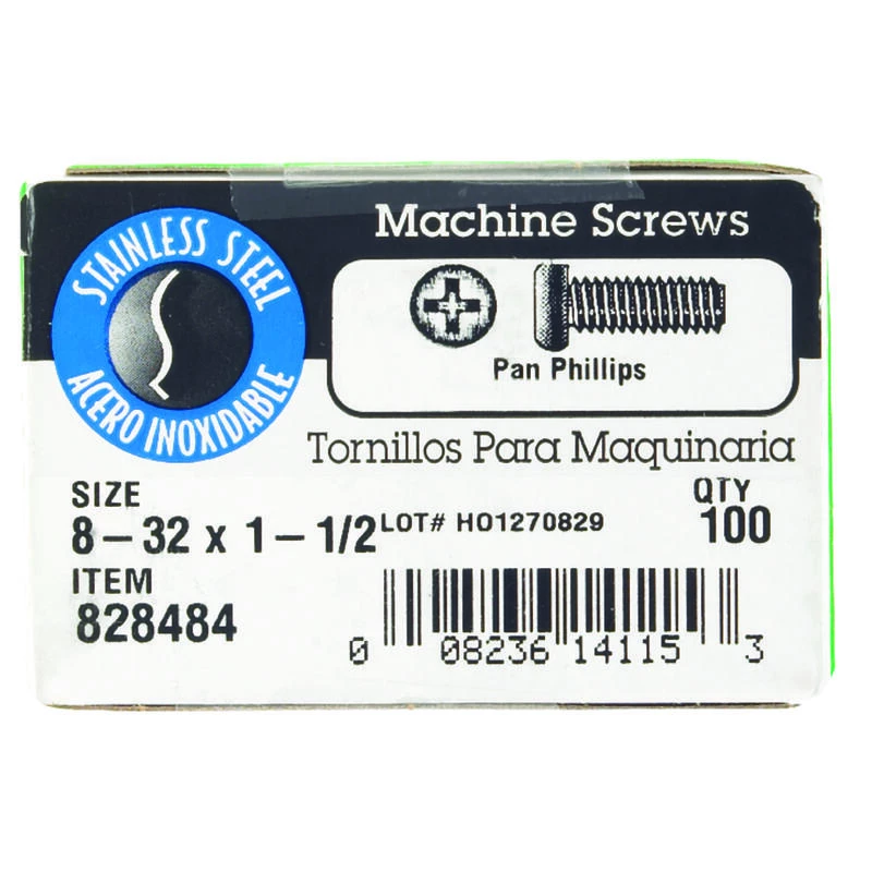 18-8 stainless steel, flat-head, Phillips-drive machine screws have a machine-cut thread throughout the length of their shank. Fasten with a Phillips screwdriver to reduce risk of over-tightening and protect the screw and fastened material. If nuts are needed, use with nuts of the same finish and threading for proper fit. Use for any indoor or outdoor projects. #8-32 coarse thread x 1-1/2″ length. *