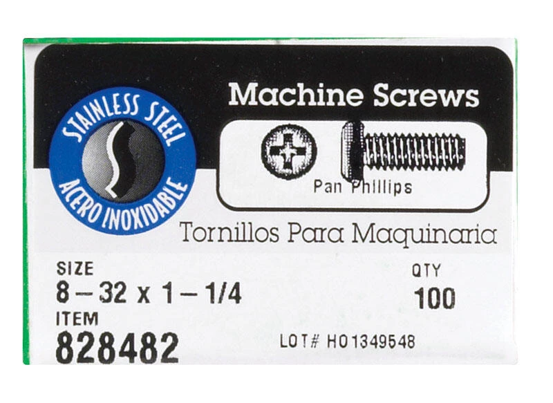 18-8 stainless steel, flat-head, Phillips-drive machine screws have a machine-cut thread throughout the length of their shank. Fasten with a Phillips screwdriver to reduce risk of over-tightening and protect the screw and fastened material. If nuts are needed, use with nuts of the same finish and threading for proper fit. Use for any indoor or outdoor projects. #8-32 coarse thread x 1-1/4″ length. *