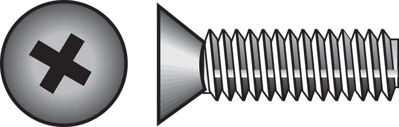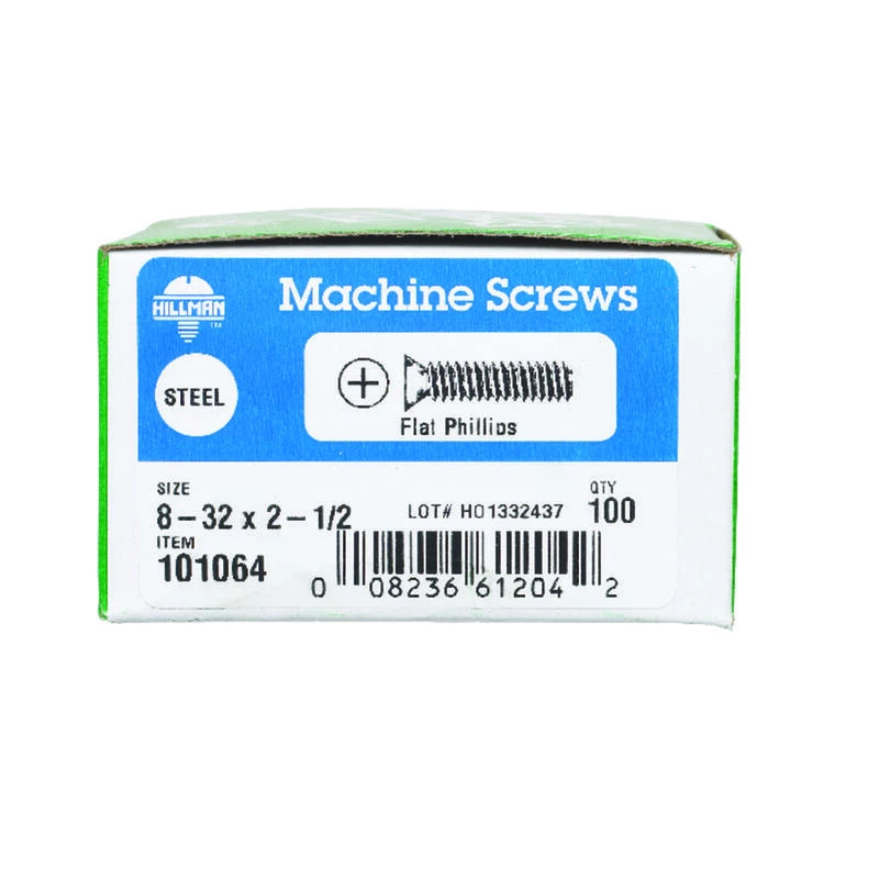 Zinc, flat-head, Phillips-drive machine screws have a machine-cut thread throughout the length of their shank. Fasten with a Phillips screwdriver to reduce risk of over-tightening and protect the screw and fastened material. If nuts are needed, use with nuts of the same finish and threading for proper fit. Use for any indoor or outdoor projects. #8-32 coarse thread x 2-1/2″ length. *
