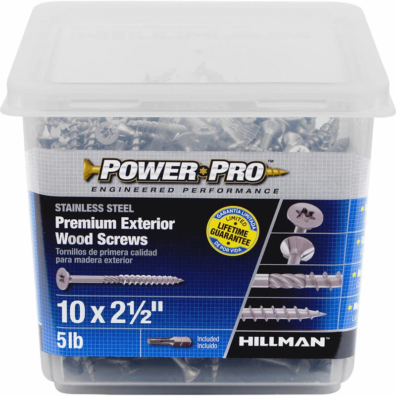 Power Pro premium exterior wood screws are perfect for decking and all other exterior wood projects. These screws feature a no-strip star drive, countersinking blades, no split twist shank and no pre-drill, Bore-Fast thread. Power Pro premium exterior wood screws include a limited lifetime guarantee against rust and corrosion. Recommended for use with treated lumber.