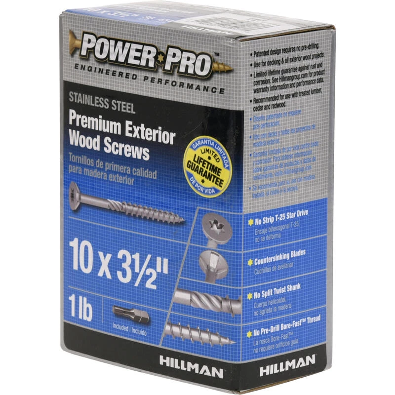Power Pro Premium 305 Stainless Steel Exterior Wood Screws offer superior corrosion resistance, and are perfect for decking and many other outdoor projects. These screws feature a no-strip star drive, countersinking blades, no split twist shank, and no pr