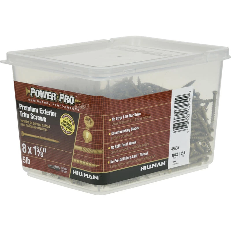 Power Pro premium wood screws are designed to provide simple solutions for your interior wood projects. These screws are made of zinc and yellow dichromate, with a no-strip star drive, countersinking blades and no split twist shank for a more controlled drive. No pre-drill is required. Packaging also stacks neatly for easy storage and organization.