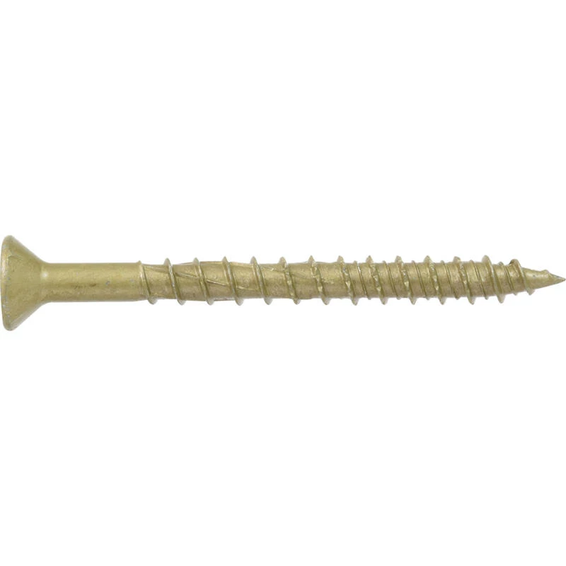 Engineered for optimum performance in multiple materials Power Pro One screws are the One screw you’ll ever need. Developed to outperform and replace standard wood sheet metal and concrete/masonry screws the One Screw program simplifies your tool box by using a single innovative engineered screw design to satisfy projects that fasten into wood metal concrete drywall and plastic. The bronze epoxy coating is recommended for exterior projects and treated lumber (Not recommended for marine applications or projects within 5 miles of coastal waters). The flat head design and star drive provide easy and clean countersinking into wood. Manufactured with spiral flutes serrated hi-lo threads and a 3-sided pyramid point no pre-drilling is required in wood drywall plastic or metal up to 20 gauge thick. Concrete and masonry applications require a pre-drilled a hole see product packaging for pre-drilling instructions.