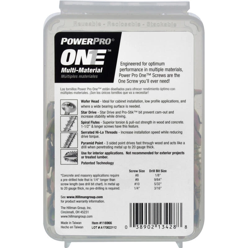 Engineered for optimum performance in multiple materials Power Pro One screws are the One screw you’ll ever need. Developed to outperform and replace standard wood sheet metal and concrete/masonry screws the One Screw program simplifies your tool box by using a single innovative engineered screw design to satisfy projects that fasten into wood metal concrete drywall and plastic. The bronze epoxy coating is recommended for exterior projects and treated lumber (Not recommended for marine applications or projects within 5 miles of coastal waters). The flat head design and star drive provide easy and clean countersinking into wood. Manufactured with spiral flutes serrated hi-lo threads and a 3-sided pyramid point no pre-drilling is required in wood drywall plastic or metal up to 20 gauge thick. Concrete and masonry applications require a pre-drilled a hole see product packaging for pre-drilling instructions.