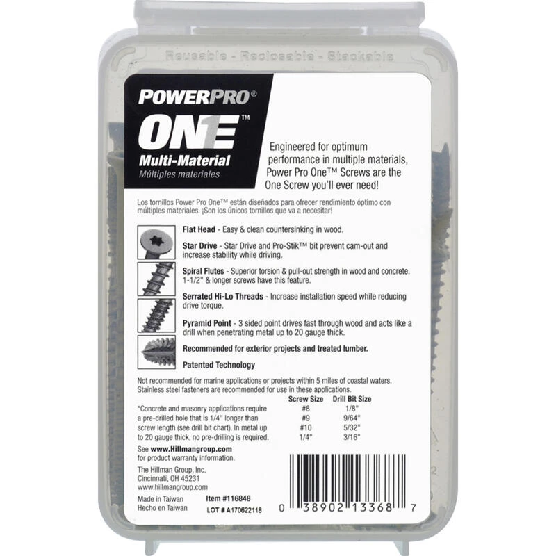 Engineered for optimum performance in multiple materials Power Pro One screws are the One screw you’ll ever need. Developed to outperform and replace standard wood sheet metal and concrete/masonry screws the One Screw program simplifies your tool box by using a single innovative engineered screw design to satisfy projects that fasten into wood metal concrete drywall and plastic. The bronze epoxy coating is recommended for exterior projects and treated lumber (Not recommended for marine applications or projects within 5 miles of coastal waters). The flat head design and star drive provide easy and clean countersinking into wood. Manufactured with spiral flutes serrated hi-lo threads and a 3-sided pyramid point no pre-drilling is required in wood drywall plastic or metal up to 20 gauge thick. Concrete and masonry applications require a pre-drilled a hole see product packaging for pre-drilling instructions.