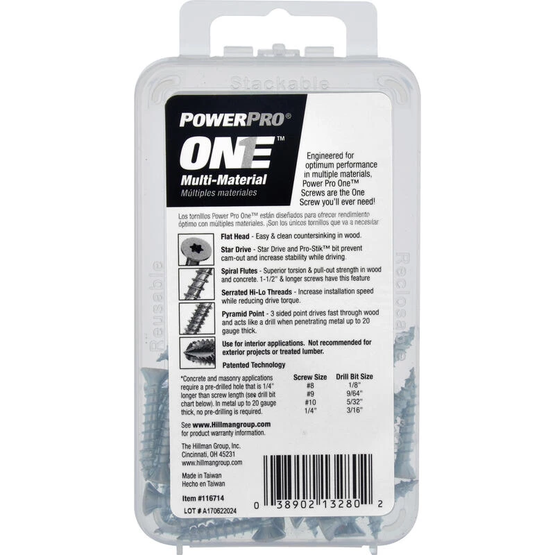 Engineered for optimum performance in multiple materials Power Pro One screws are the One screw you’ll ever need. Developed to outperform and replace standard wood sheet metal and concrete/masonry screws the One Screw program simplifies your tool box by using a single innovative engineered screw design to satisfy projects that fasten into wood metal concrete drywall and plastic. This zinc plated screw is ideal for interior applications; it is not recommended for exterior projects or treated lumber. Its flat head design and star drive provide easy and clean countersinking into wood. Manufactured with spiral flutes serrated hi-lo threads and a 3-sided pyramid point no pre-drilling is required in wood drywall plastic or metal up to 20 gauge thick. Concrete and masonry applications require a pre-drilled a hole see product packaging for pre-drilling instructions. Each package includes a free durable Pro-Stik Star Driver Bit. All One Screw products offer a limited lifetime warranty.