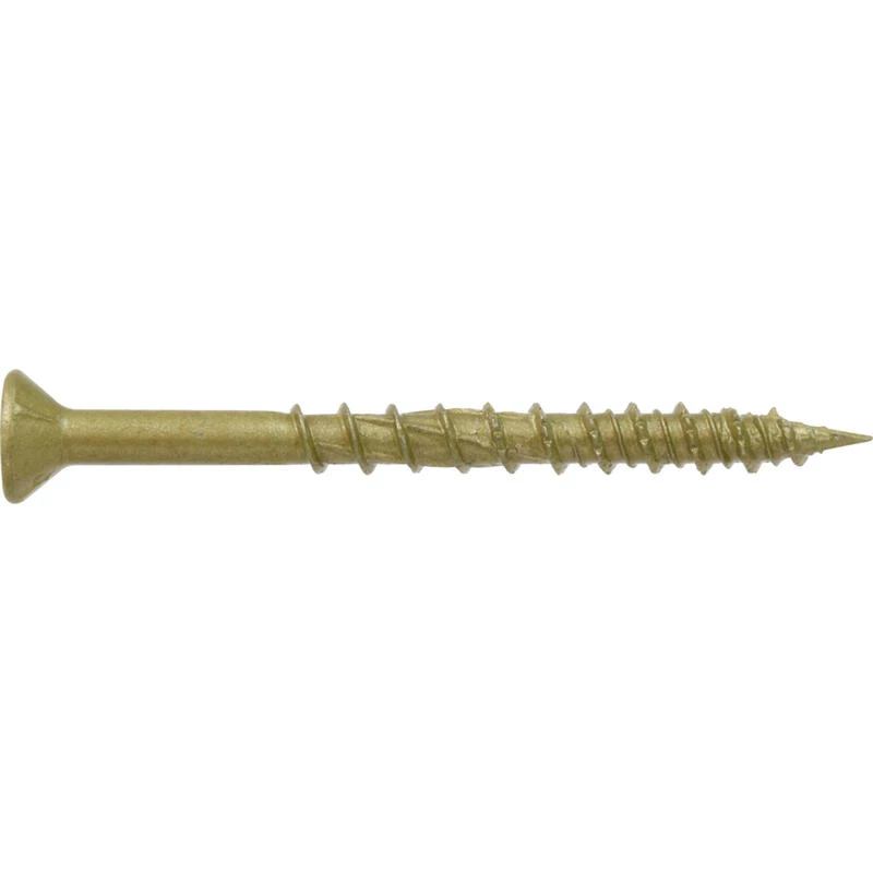 Engineered for optimum performance in multiple materials Power Pro One screws are the One screw you’ll ever need. Developed to outperform and replace standard wood sheet metal and concrete/masonry screws the One Screw program simplifies your tool box by using a single innovative engineered screw design to satisfy projects that fasten into wood metal concrete drywall and plastic. The bronze epoxy coating is recommended for exterior projects and treated lumber (Not recommended for marine applications or projects within 5 miles of coastal waters). The flat head design and star drive provide easy and clean countersinking into wood. Manufactured with spiral flutes serrated hi-lo threads and a 3-sided pyramid point no pre-drilling is required in wood drywall plastic or metal up to 20 gauge thick. Concrete and masonry applications require a pre-drilled a hole see product packaging for pre-drilling instructions.