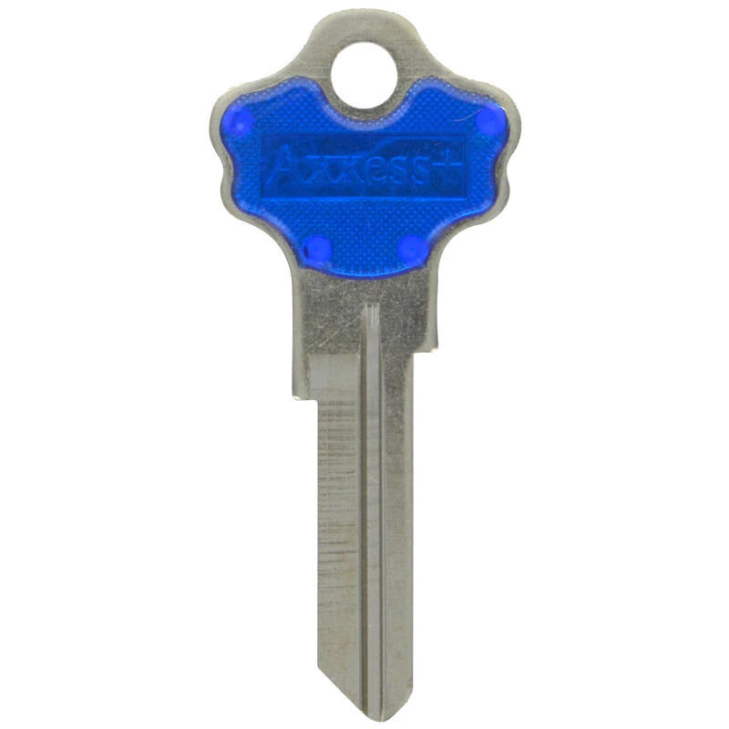 Compatible with some Kwikset locks, this key is a durable and cost effective way to ensure the safety of your office or home. The wide, flat head makes gaining a strong grip easy. This key can be customized with a quick trip to your local hardware store. This key features a a colorful plastic insert that helps for easy key identification. Available in blue, red, and green.