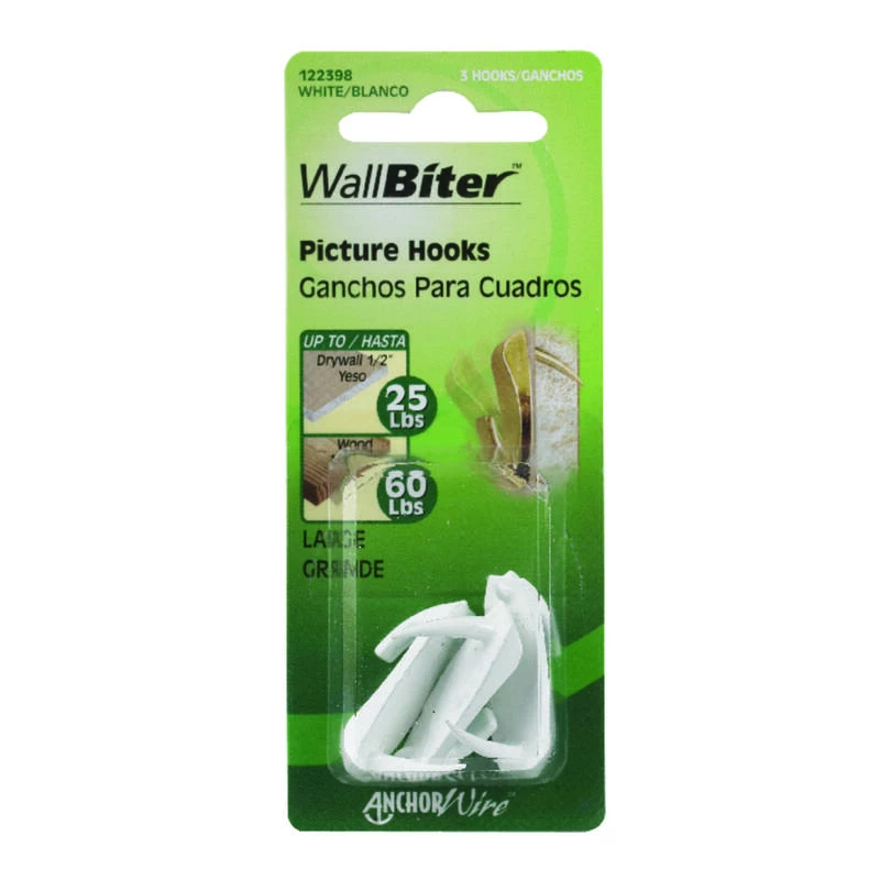 Hillman Wall Biters provide a strong durable hold when hanging your pictures, Available in small (30lbs), medium (45lbs), and large (60lbs) sizes to ensure weight ratings meet your hanging needs. Also available in white, brass finishes. Please read back of package when hanging in drywall vs. wood, weight rating will change. *